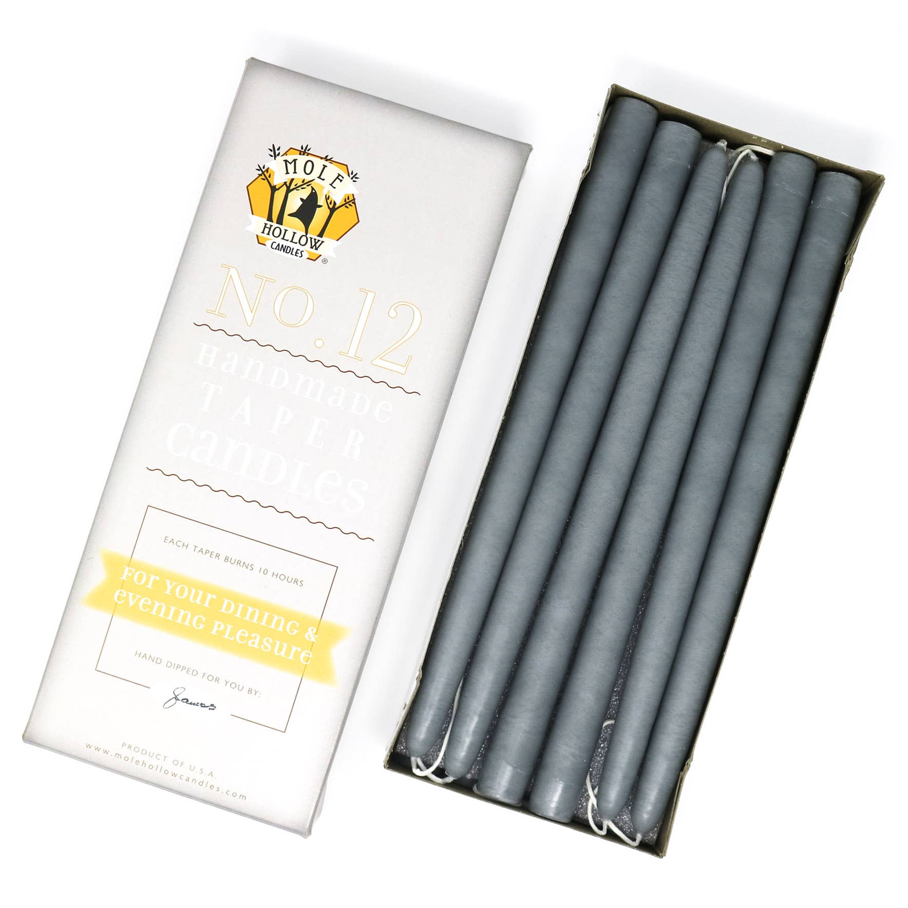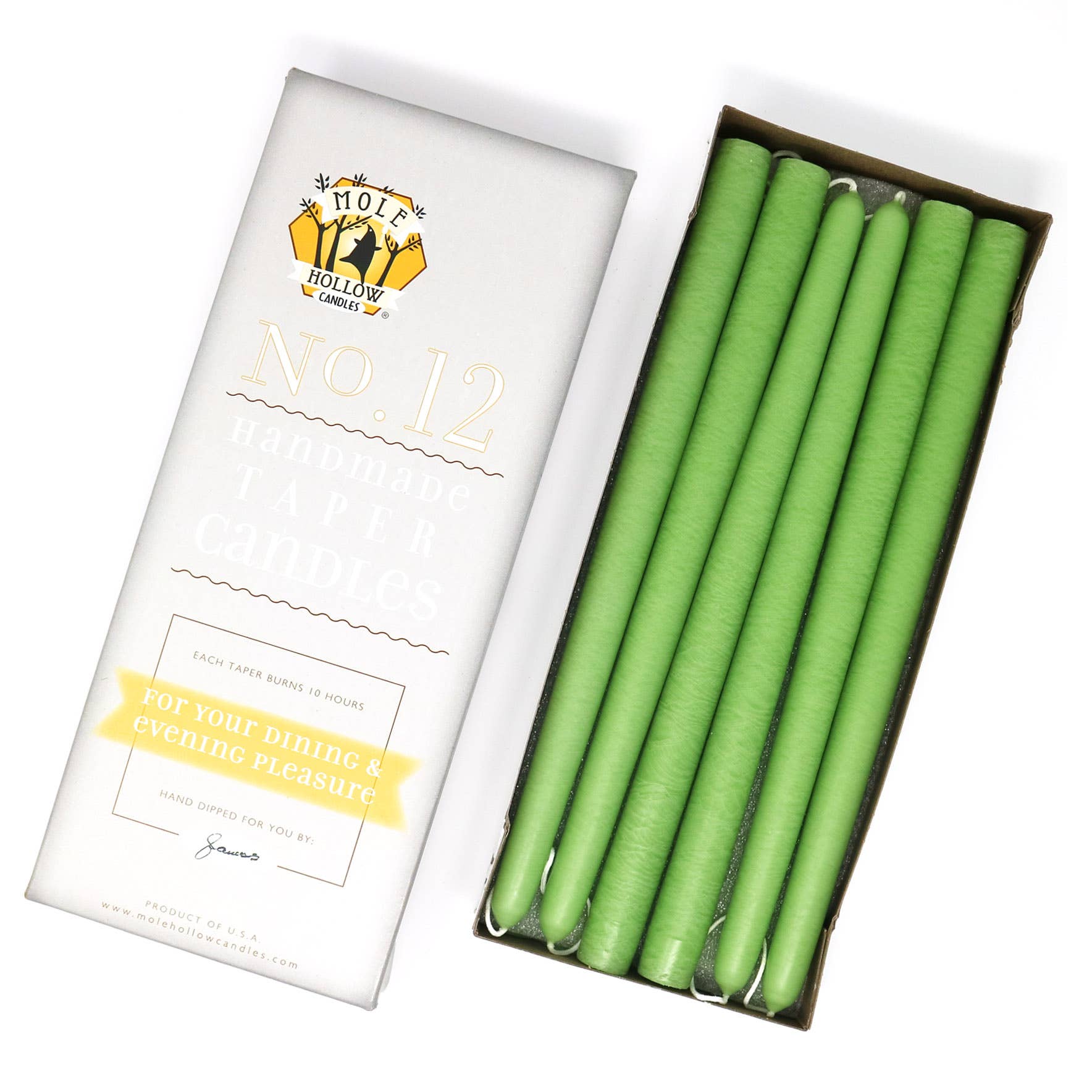Mole Hollow 12” unscented taper candles are hand dipped and available in 39 colors. Each taper candle has a 100% cotton wick and solid color throughout. Christmas candle color bestsellers include Sweetheart Red, Emerald Green and Stark White.