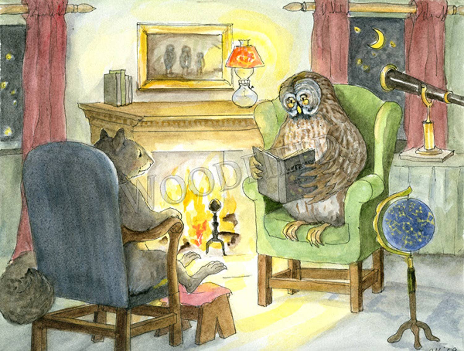 Read moreIndividual 5-1/8" x 7" notecard comes with a white envelope. Front of card has image with a white border. The inside is blank. A short storyline is written on the back of the card. "Squirrel spent cozy winter evenings warming his toes by the fire while listening to Owl expound on the nature of the universe and other mysterious things." Also Available as a Matted Print, ready for framing - See our Print Section