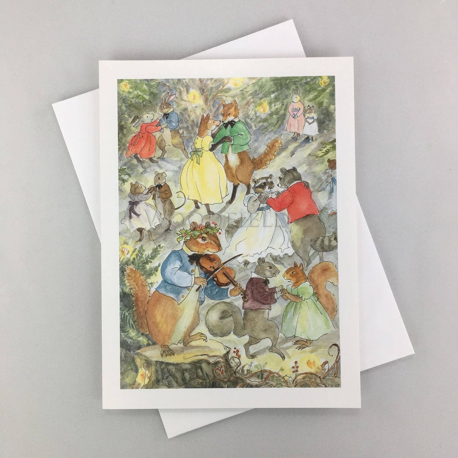 Read moreIndividual 5-1/8" x 7" notecard comes with a white envelope. Front of card has image with a white border. The inside is blank. A short storyline is written on the back of the card. "Lanterns lit up the branches, and laughter and merriment filled the forest as the dancers stepped high to bring in the New Year." Also Available as a Matted Print, ready for framing - See our Print Section