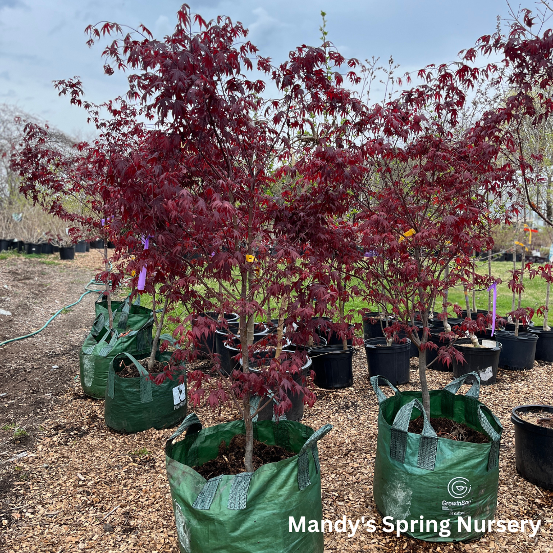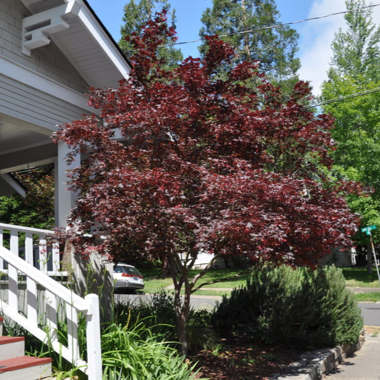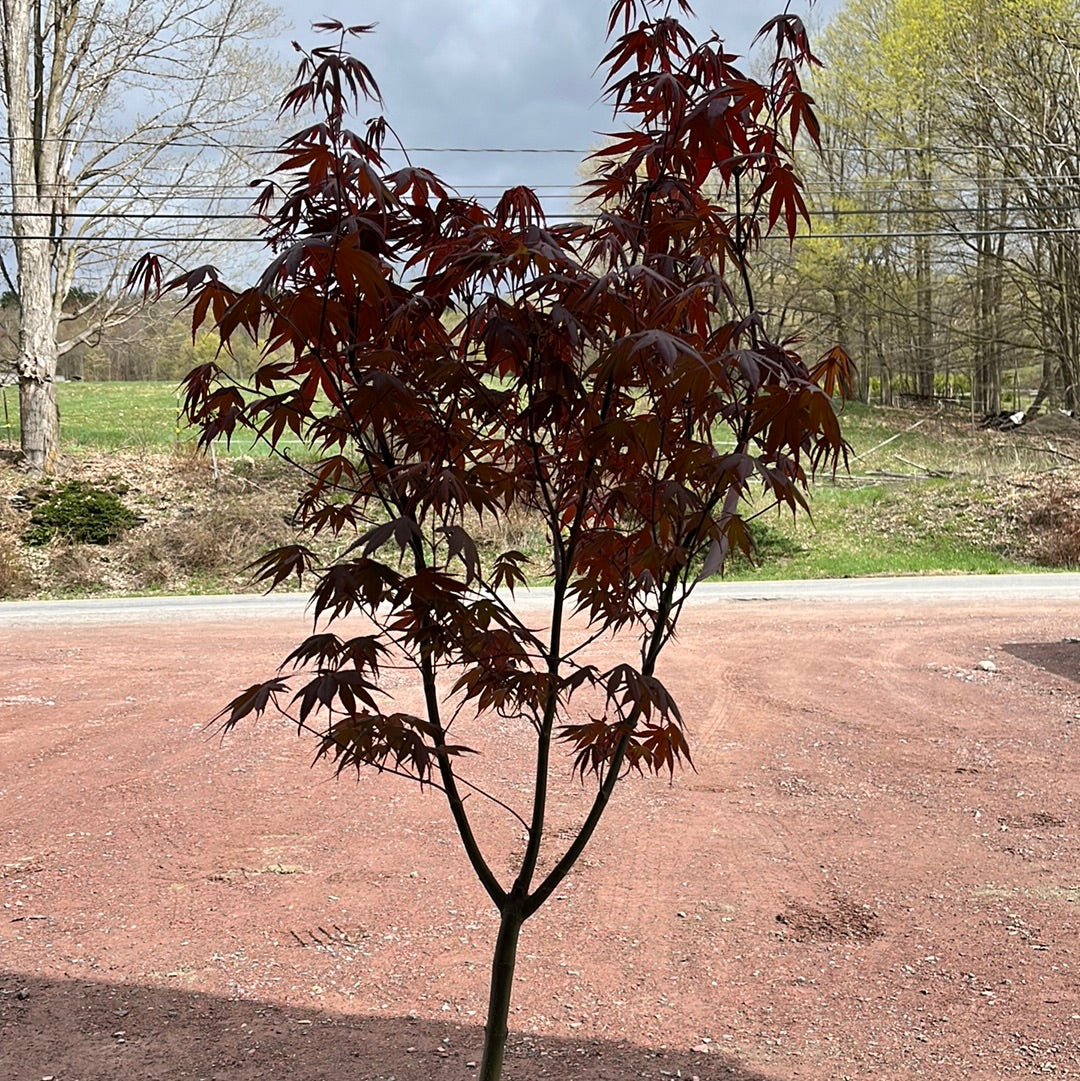 A small statement tree with burgundy foliage that turns brilliant red in the fall. A hardy Japanese maple tree, with good sun tolerance. Mature Height: 15-20' tall Mature Spread: 10-15' Exposure: Full Sun to Partial Sun Growth Rate: Slow Zone Hardiness: 5-9.