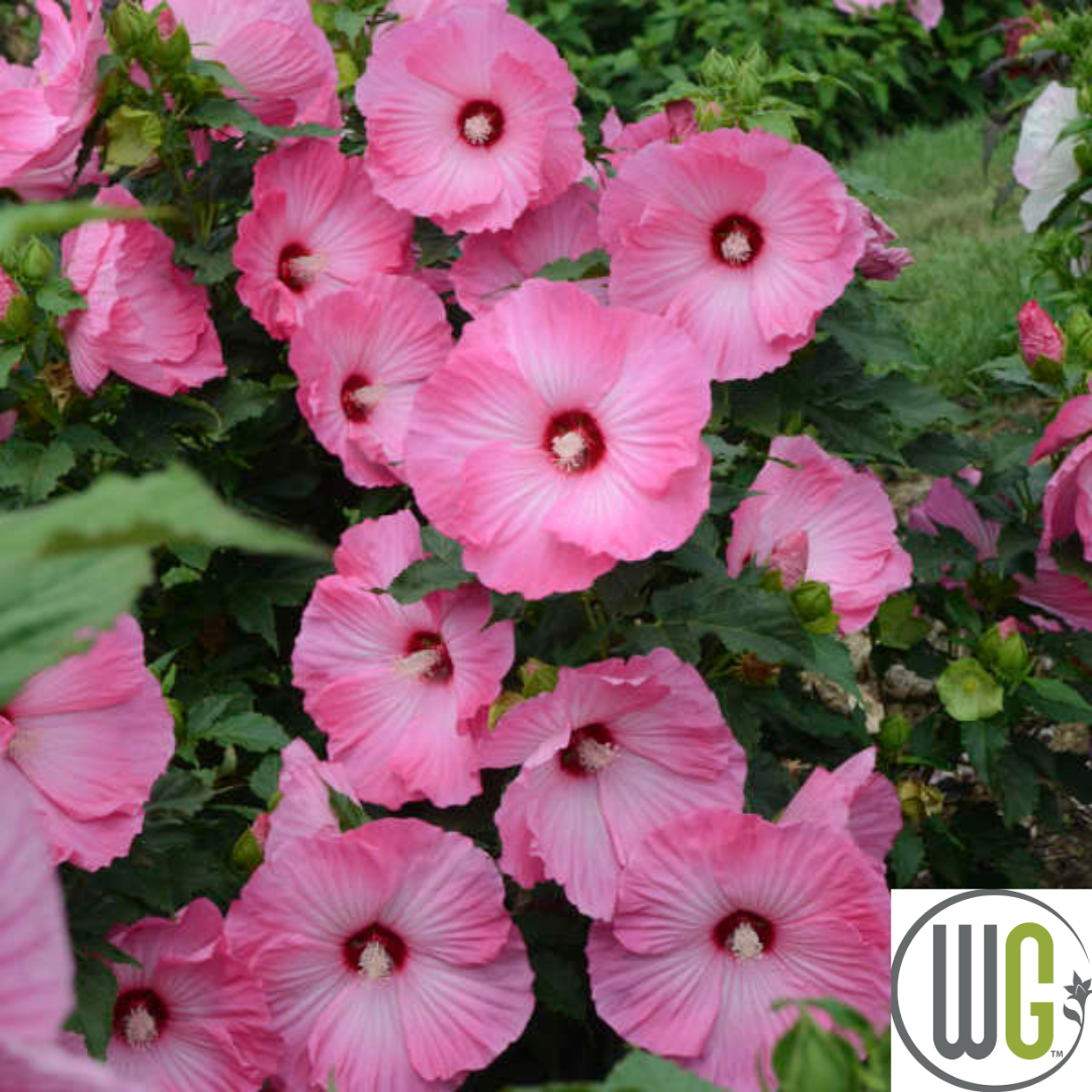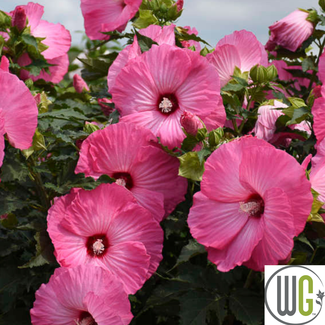 Read moreThe beautiful art deco pattern of this Hardy Hibiscus looks like it has been spray painted, and you'll love how it makes your garden look! 8-8½", vibrant pink flowers with salmon tones have an airbrushed central white halo and a small dark red eye. Overlapping petals create a three dimensional look to the flowers. The rich, dark green foliage forms a compact habit. Lots of flower buds translates to a long season of bloom, so you can enjoy these flowers for many weeks. Use 'Airbrush Effect' as a focal point in your sun garden.