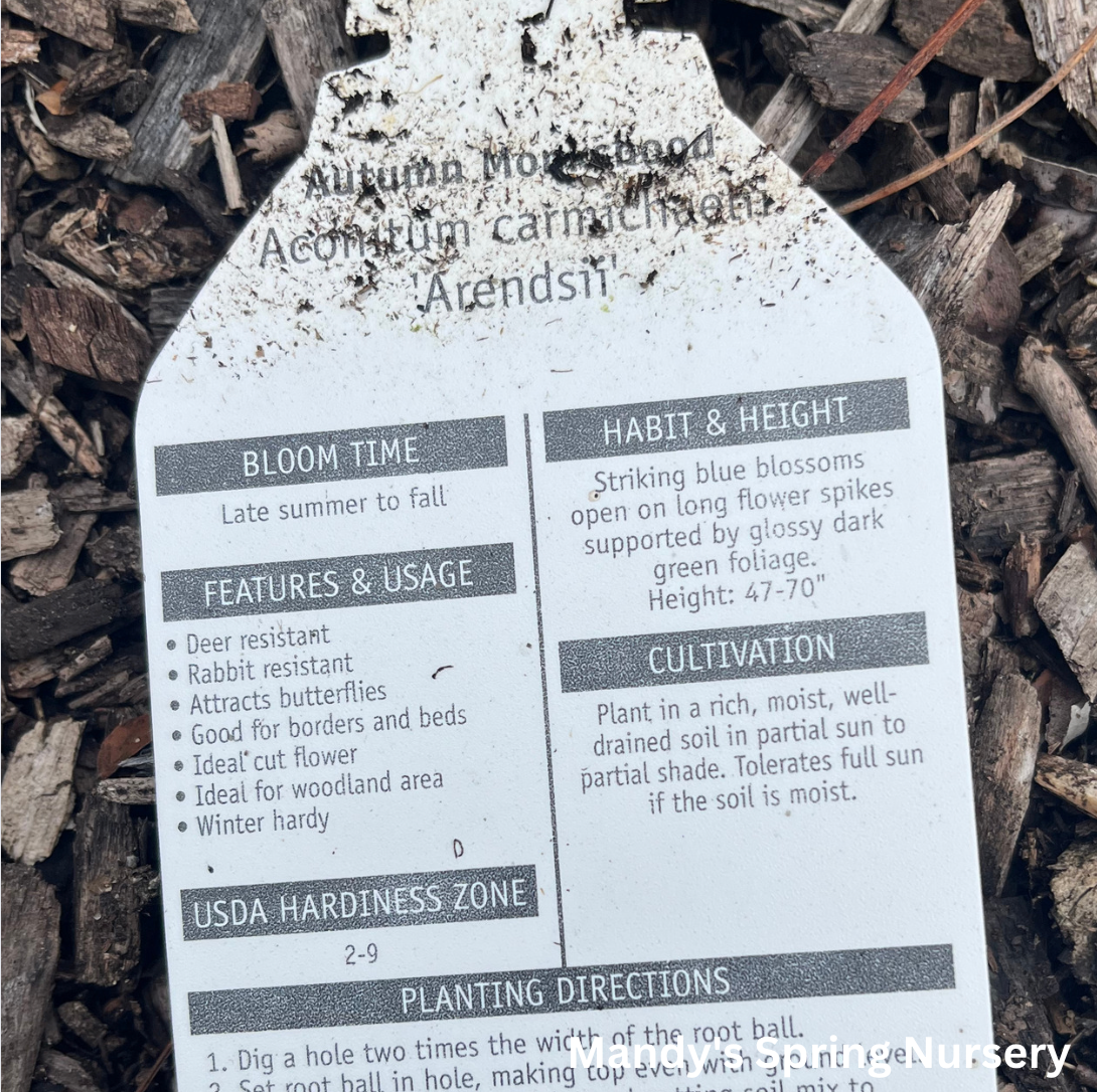 Monkshood are wonderful old-fashioned perennials, perfectly suited for large border plantings. This late-flowering selection has incredible, tall spikes of deep violet-blue, hooded flowers, a total surprise when they appear in mid-autumn. Attractive dark green, glossy foliage. Stems may need to be staked in summer. An outstanding cut flower. Plants prefer a site that will not dry out in summer, away from thirsty tree roots. Easily divided every 3 to 4 years, in early spring. CAUTION: toxic if eaten/harmful via skin.