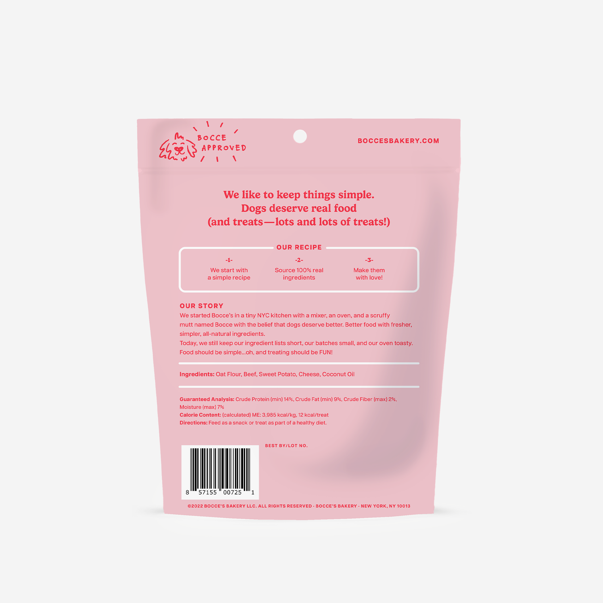 Read moreThese "fast food" faves are made the good way, from four simple ingredients: oat flour, cheddar cheese, sweet potatoes, and 100% USA beef. Oh, and did we mention these babies have 14% protein? You’re welcome, cross-fit pups. * 5 oz. * Wheat-Free * 100% Real Ingredients * Baked in the USA Ingredients: Oat Flour, Beef, Cheese, Sweet Potato Guaranteed Analysis: Protein: 14% Fat: 9% Fiber: 2% Moisture: 7% Calories: 12 Cal/treat