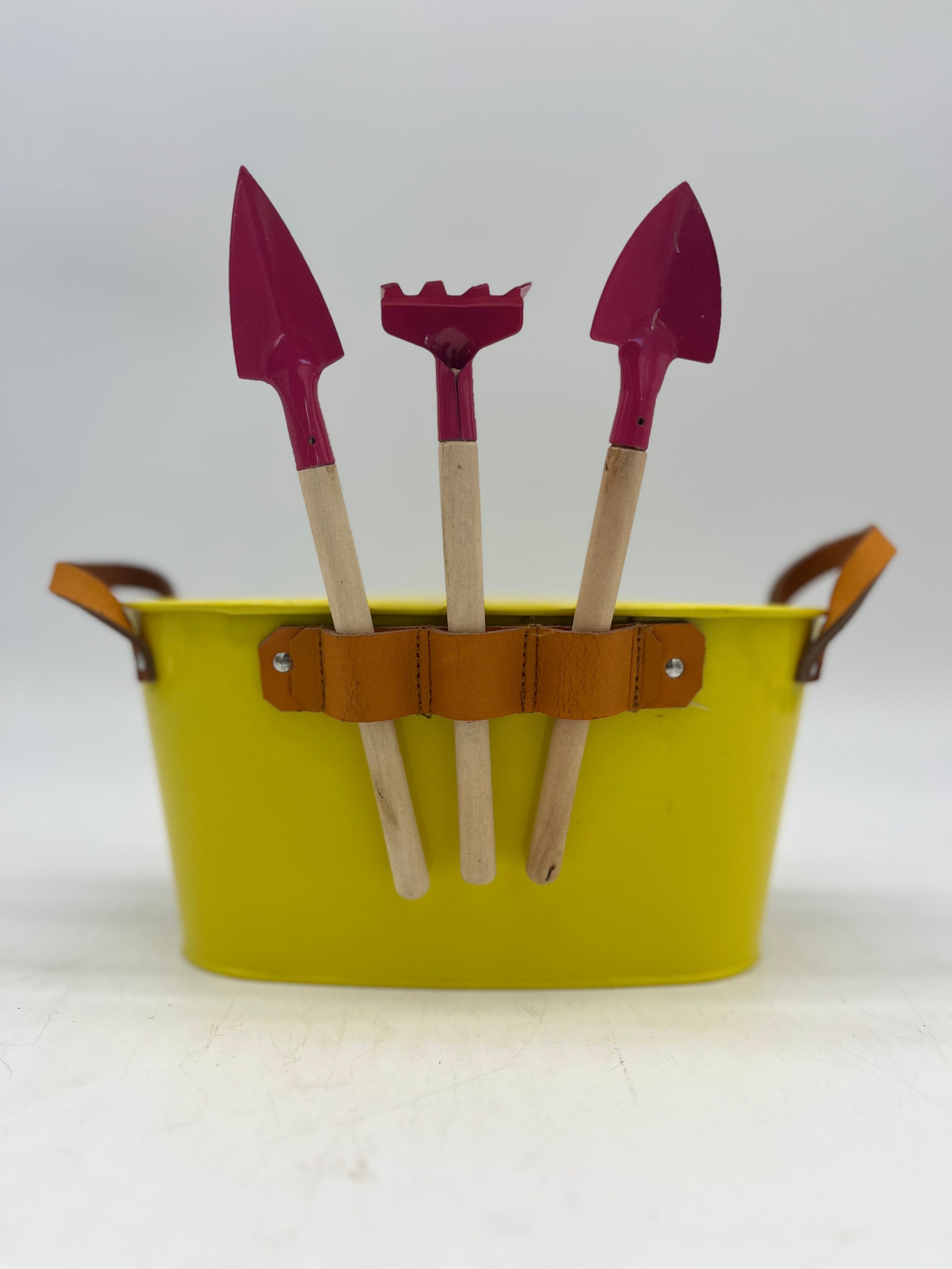 Assorted Oval Metal Planter Includes a mini fork and two mini shovels 9. 5” x 4. 75” opening 4” height.