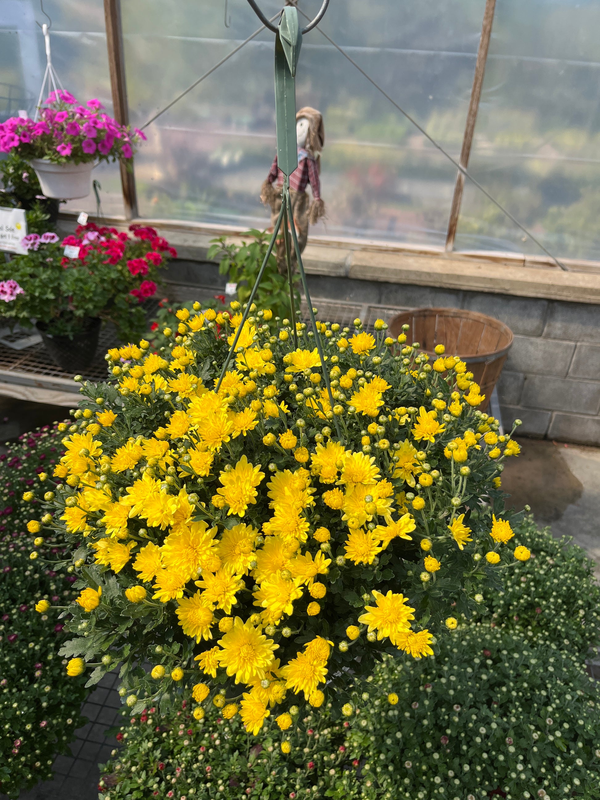 Hanging baskets of mums in assorted colors Single and Combo color Available.
