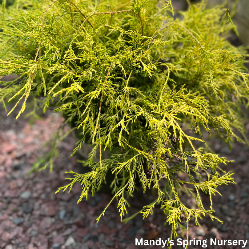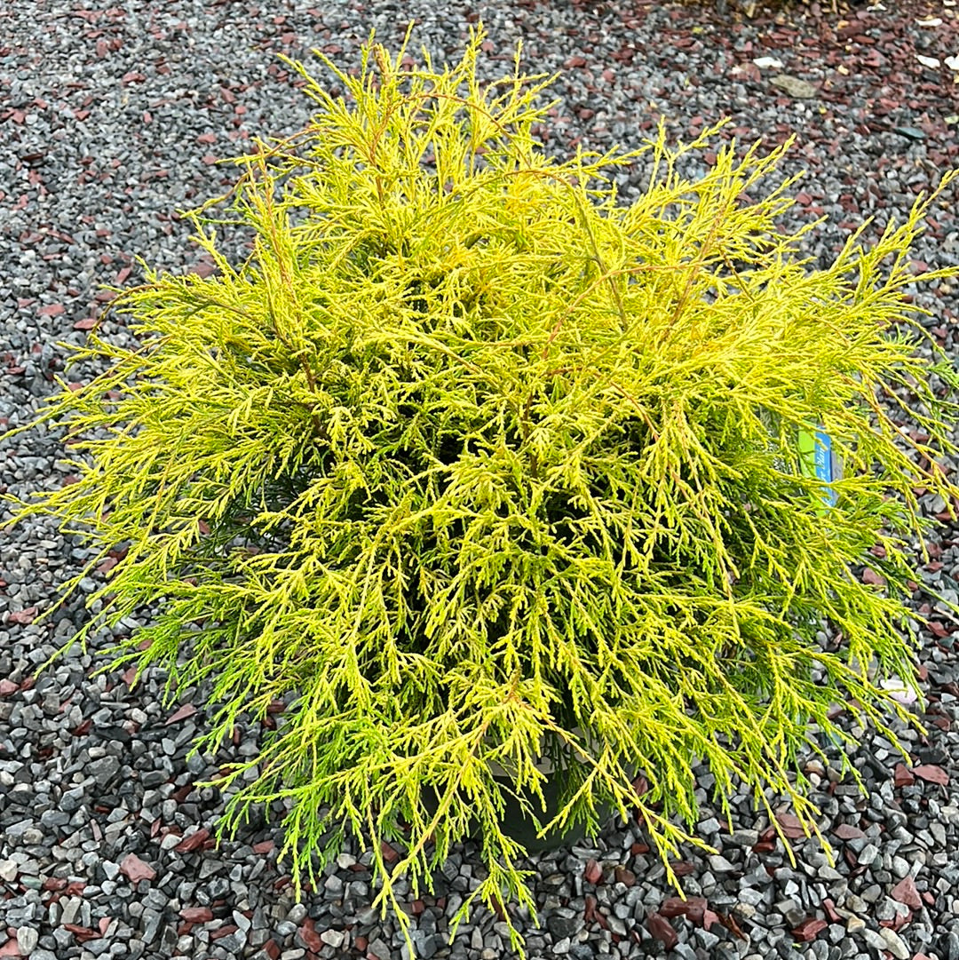 A compact conifer with interesting, thread-like needles that weep and drape over the entire shrub. Bright, golden yellow new foliage, even in full sun. An excellent semi-erect, mop-headed landscape specimen or accent plant that makes a nice background border or small hedge. Slow growing; size can be maintained with minimal pruning. Evergreen.