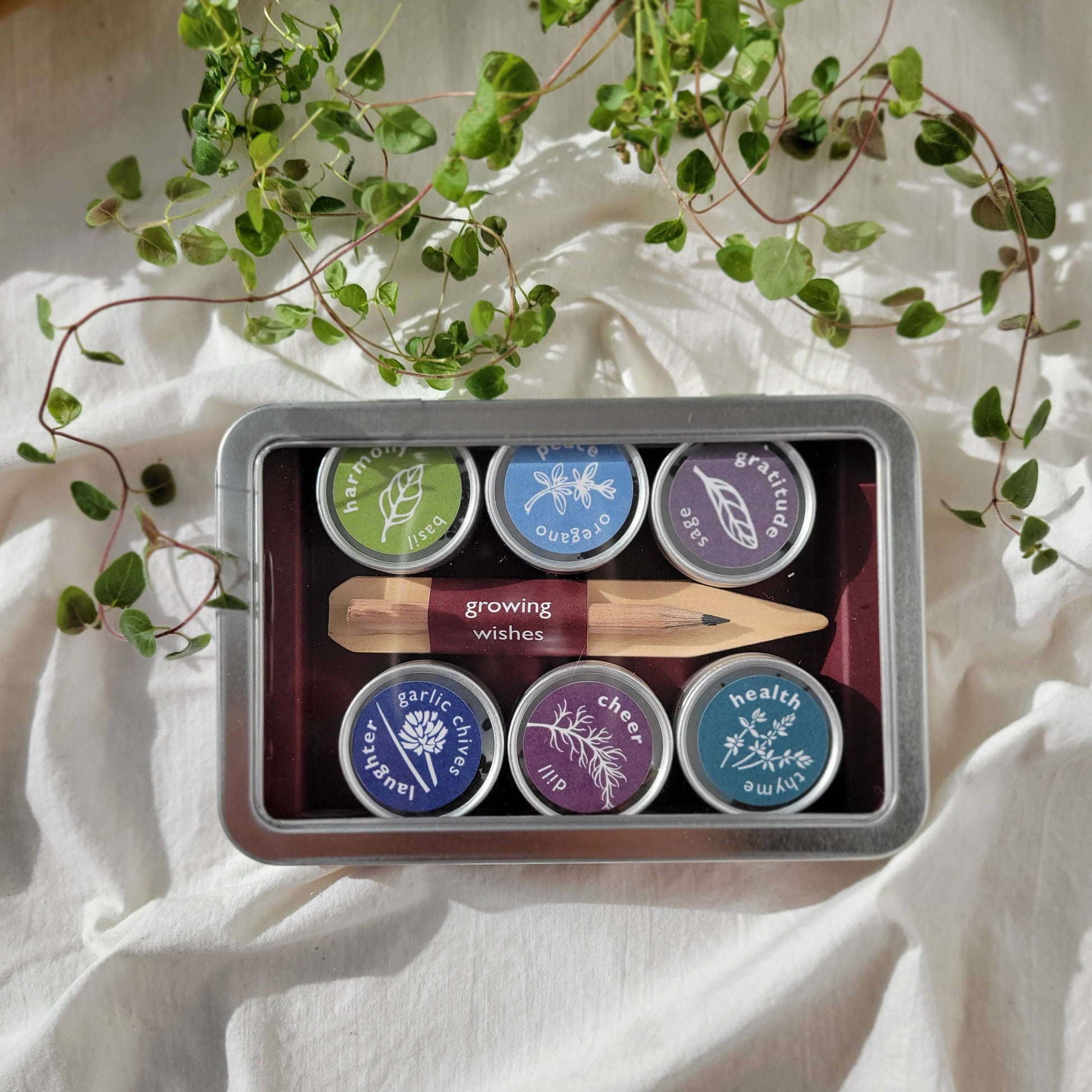 Read moreThis kit pairs six varieties of organic herbs with the sentiment it symbolizes {dill/cheer, oregano/peace, sage/gratitude, thyme/health, basil/harmony, garlic chives/laughter). These herbs are easy to grow, fragrant and include a wonderful culinary collection for any cook. As they grow you are reminded of nature's simple beauty. Plant outdoors in a garden or in containers. Includes: 6 organic seed varieties, steel case, wooden garden stakes with pencil, planting & growing directions. Handmade in Idaho. Great gift for cooks! Our Growing Wishes Herb kit brings cheer and makes a thoughtful holiday gift, perfect for Christmas displays, seasonal gifting, boutique shops, artisanal gifts, indoor gardens, botanical gifts, herb gardening, holiday décor, gardeners, and Faire buyers seeking handmade treasures.