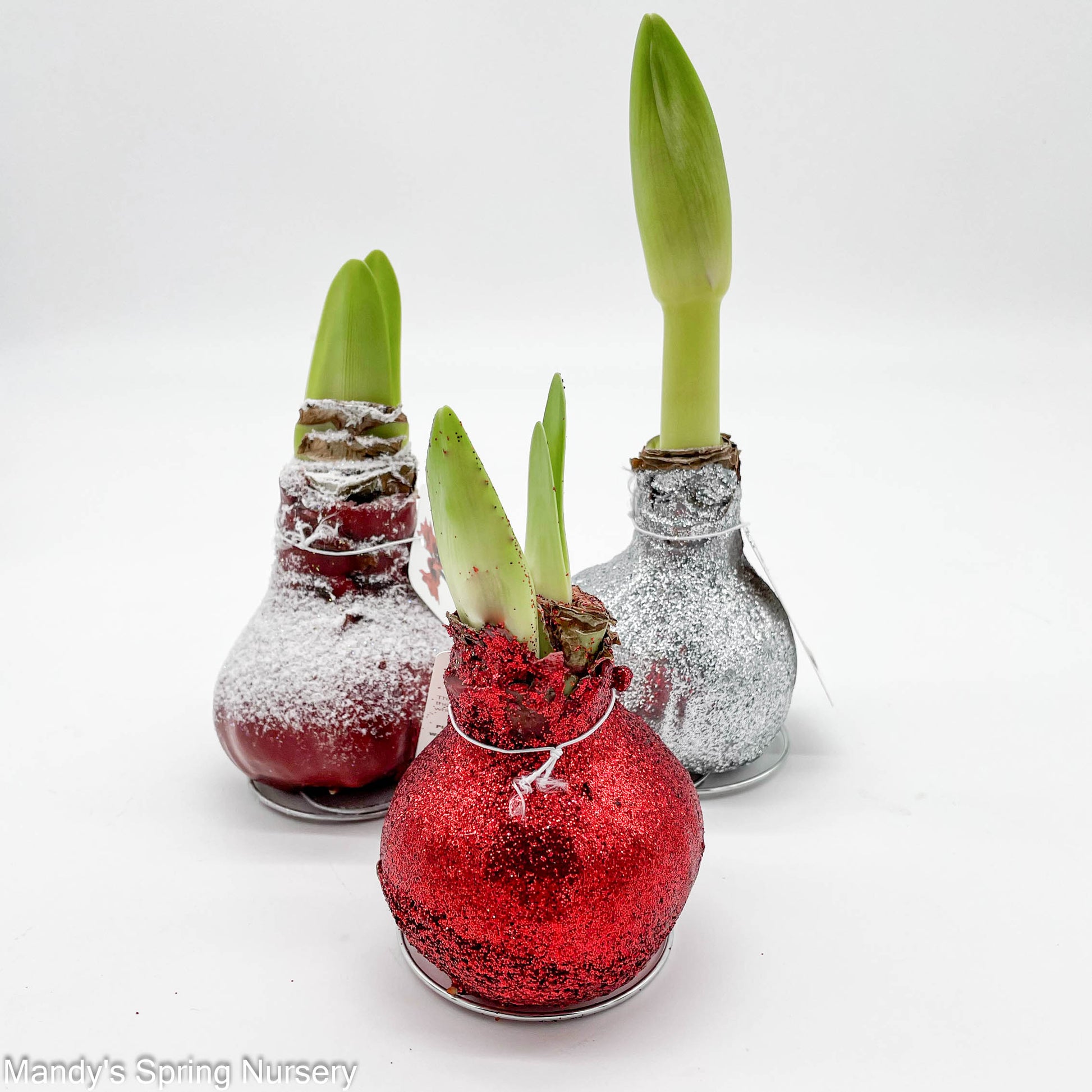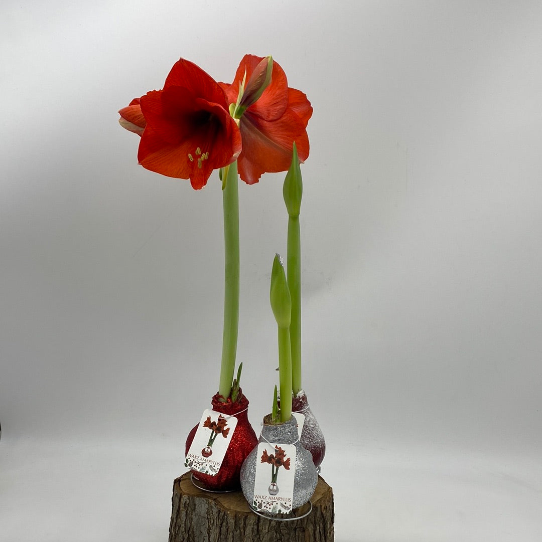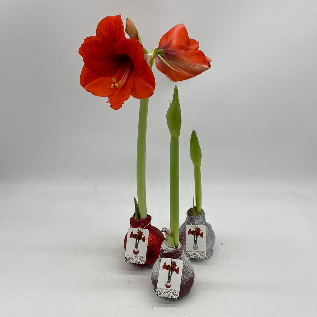 Colorful wax Amaryllis bulbs. No watering needed! Enjoy indoor blooms for the holidays.