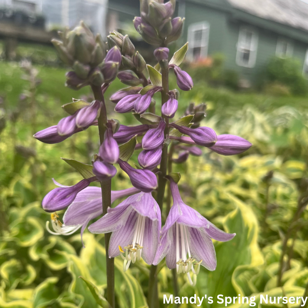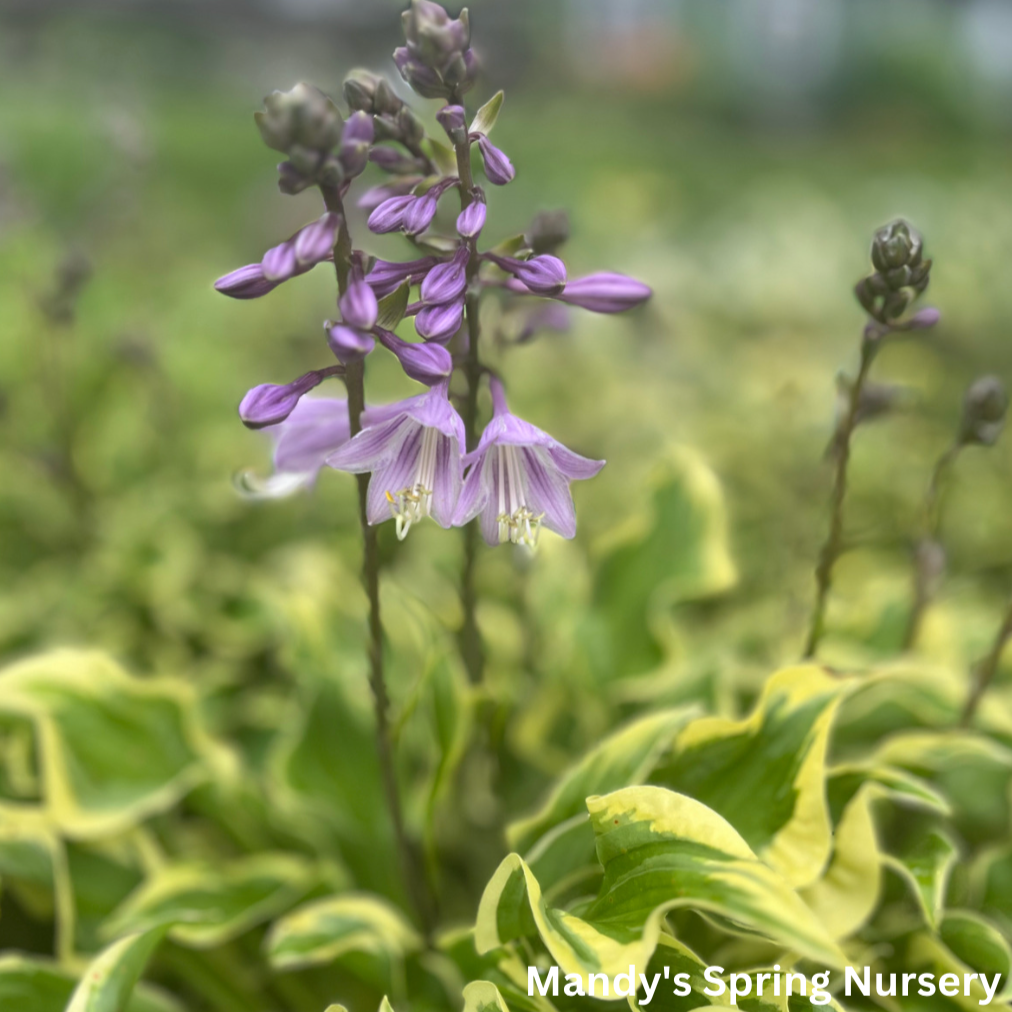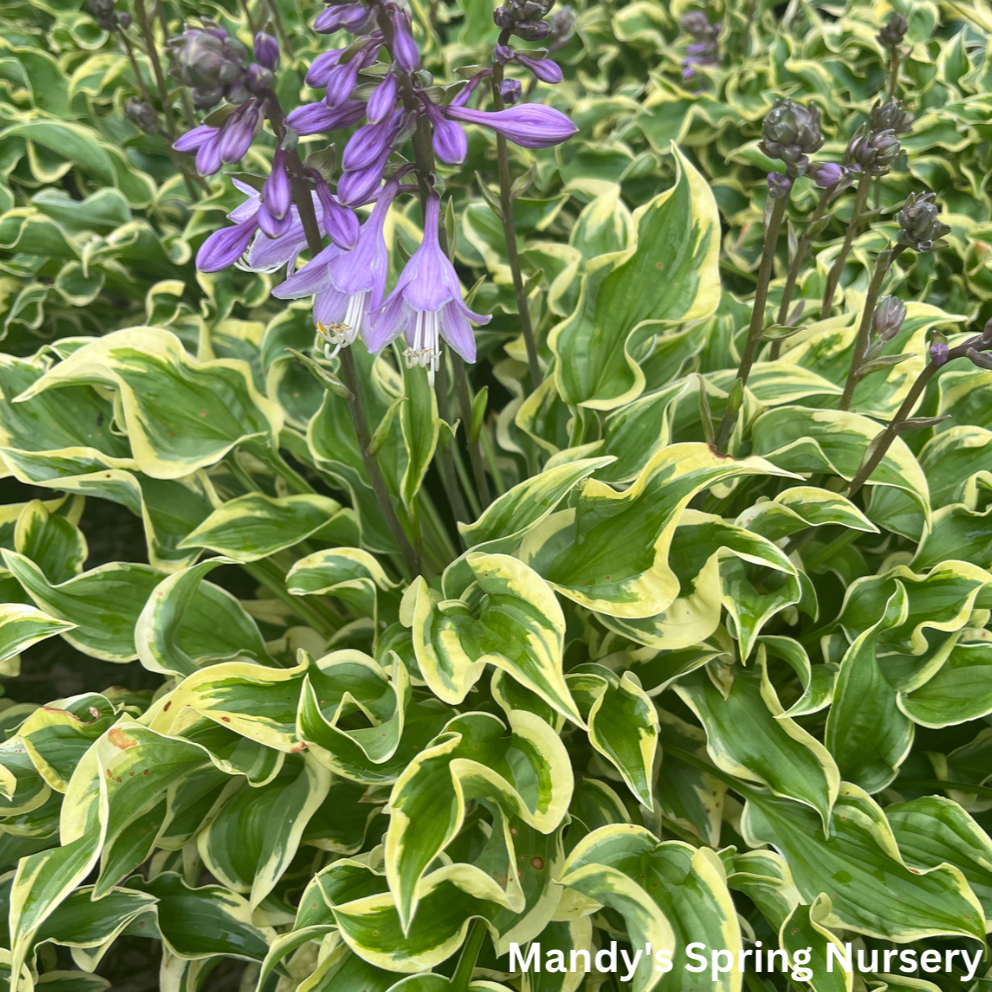 Read moreThis sport of the classic variety ‘Pilgrim’ shows a little more character with showy, wavy margins. Leaves have a single prominent wave that begins one third of the way from the leaf base. Dark green leaves have creamy yellow margins in spring, maturing to creamy white margins in summer. Gray-green color appears where the margins and centers overlap. Lavender flowers appear above the foliage in midsummer. Sizes measured are based on a five year clump. A vigorous, fast-growing variety suitable for edging or landscapes.