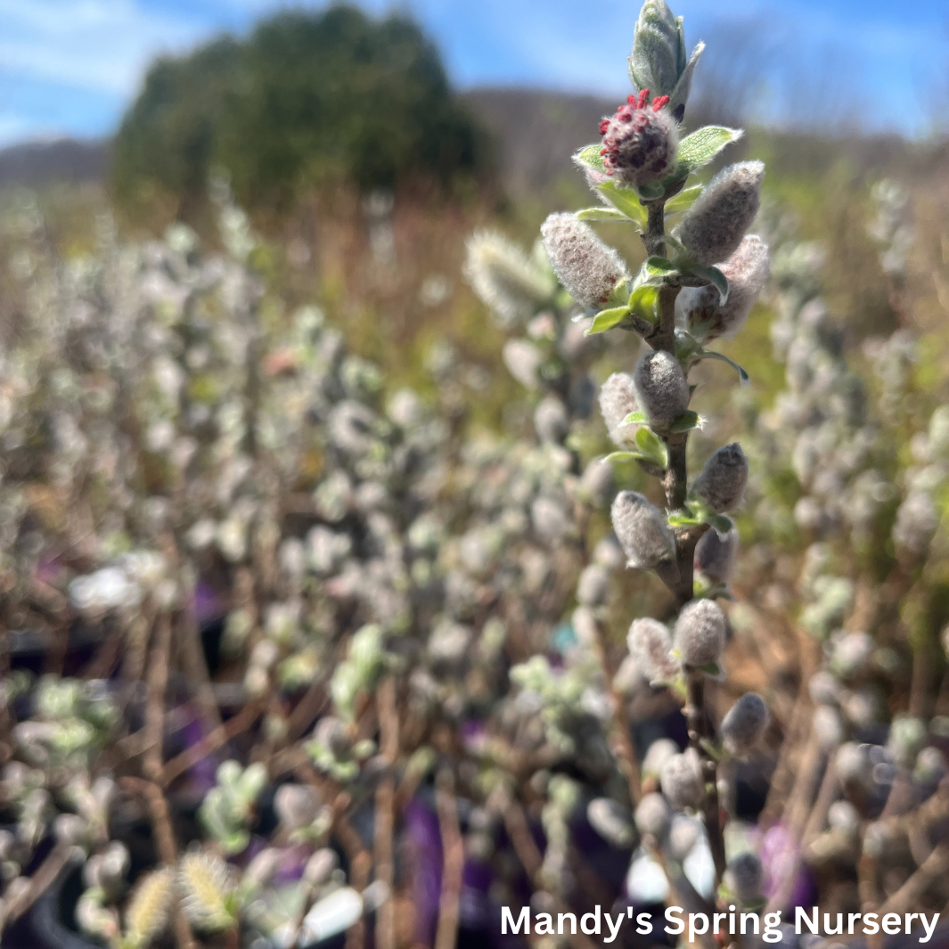 Iceberg Alley™, a native plant discovered by the Memorial University of Newfoundland and Labrador Botanical Garden. Powdery, silver foliage of this small shrub is a great addition to the landscape, adding texture and contrast when combined with other shrubs. Forming a rounded shrub and does not overtake the landscape, reaching a height and spread of about 5' (a bit shorter in very cold areas and a bit taller in warmer zones). It blooms in spring with silver catkins, red stamens and nectar for pollinators. Tolerant of moist soils and a good choice for rain gardens. Grows best in full sun and tolerates pruning beautifully. Consider cutting the stems in early spring for the decorative catkins.