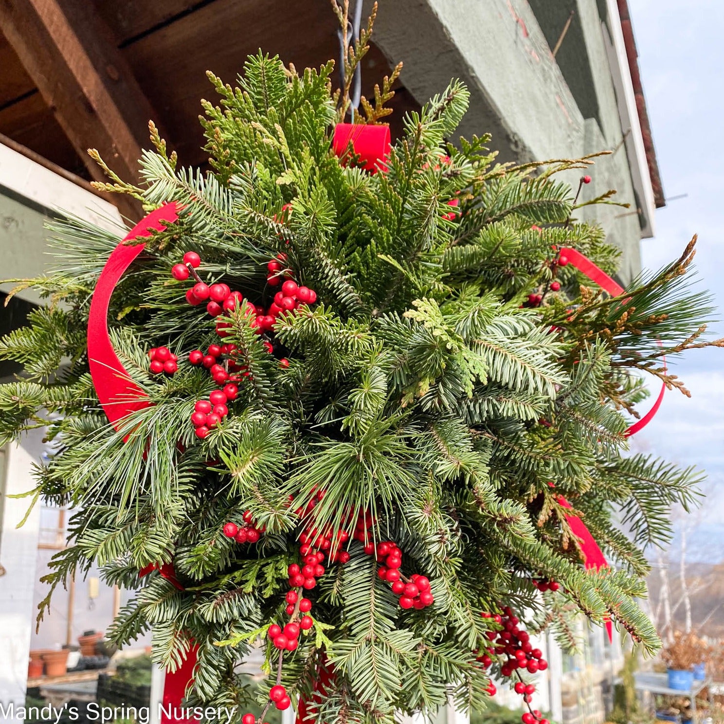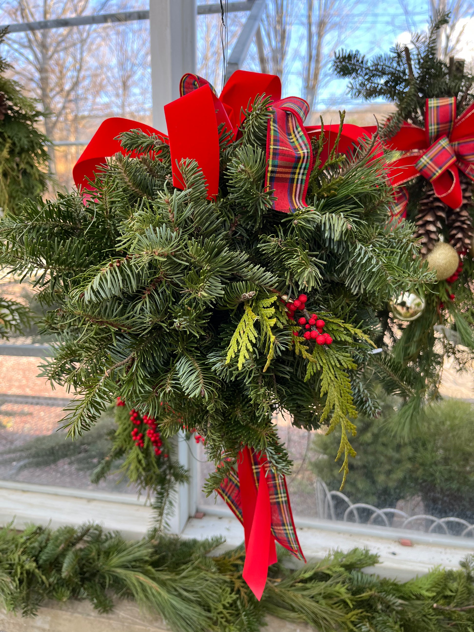 Classic long-lasting kissing balls made using mixed evergreen boughs, (optional) holly berries harvested from our nursery fields. Additional holly berries, pine cones, and other décor can be purchased separately and added to any kissing balls. If you would not like holly berries or pine cones on your kissing balls, please specify under "Order Special Requests" at checkout.