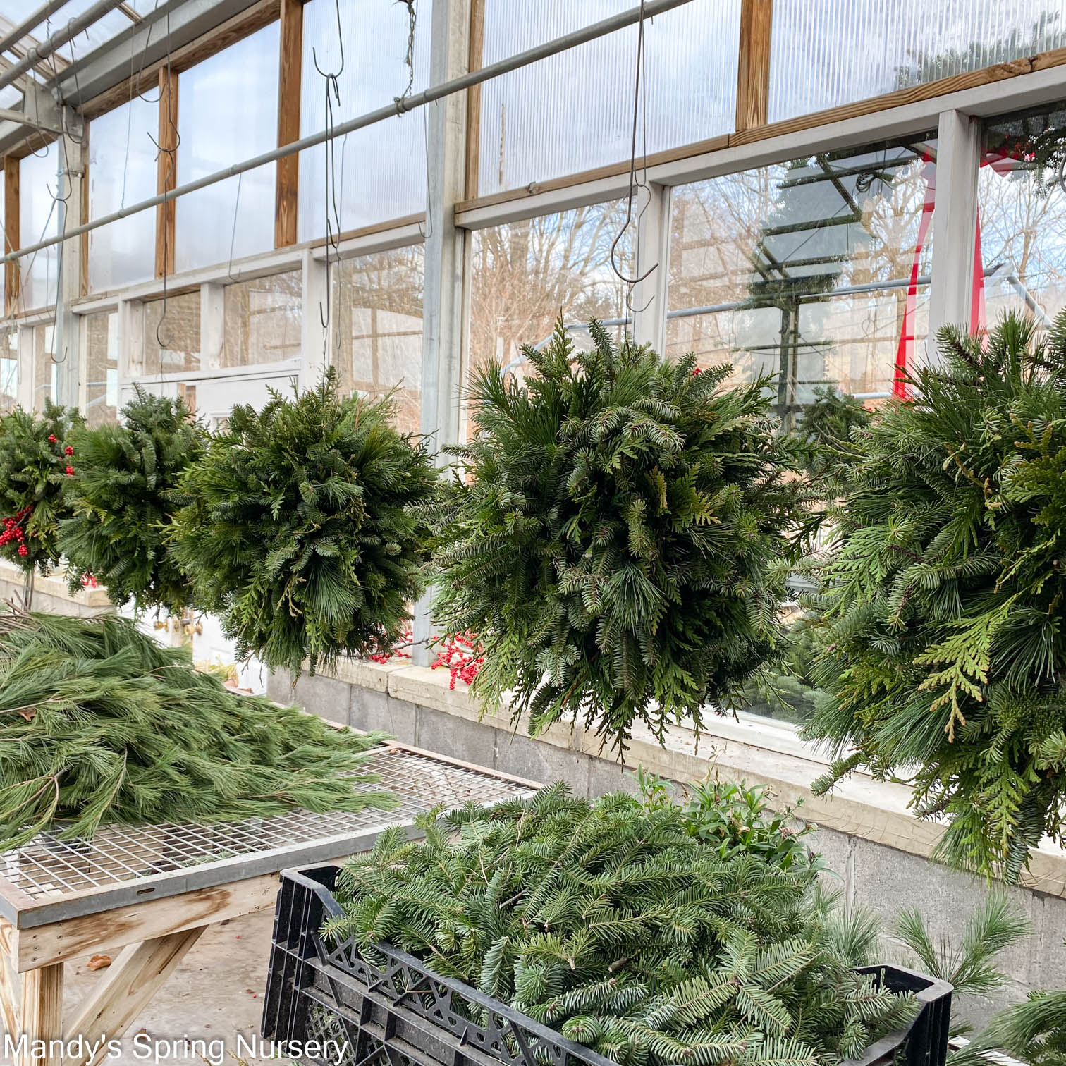 Mixed greens kissing balls, 12-16" Also available a a non-fragrant, hypoallergenic boxwood kissing ball Classic long-lasting kissing balls made using mixed evergreen boughs, (optional) holly berries harvested from our nursery fields.