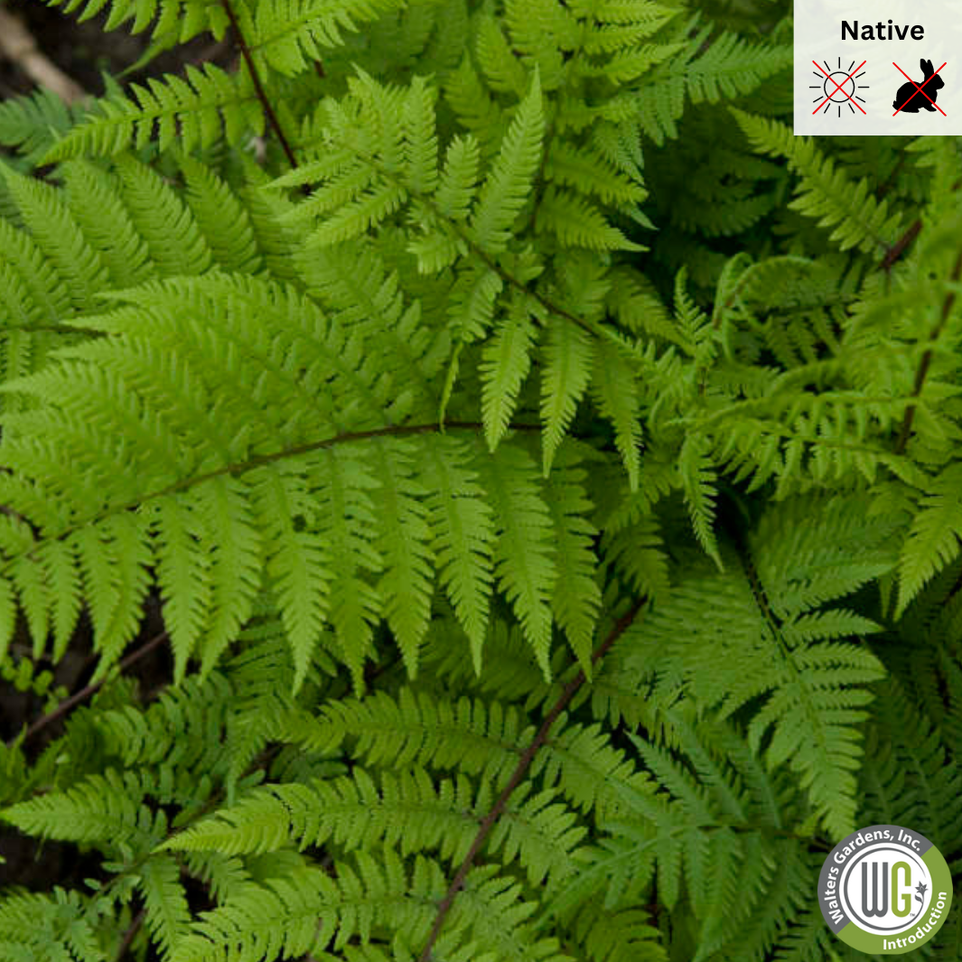 Native to North America. This fern's vibrant burgundy stems coupled with its dark green fronds will compliment everything else in your shade garden. When planted amidst the dark purple leaves of coral bells, its burgundy stems really stand out. Height: 30. 0-36. 0 Inches Spread: 24.