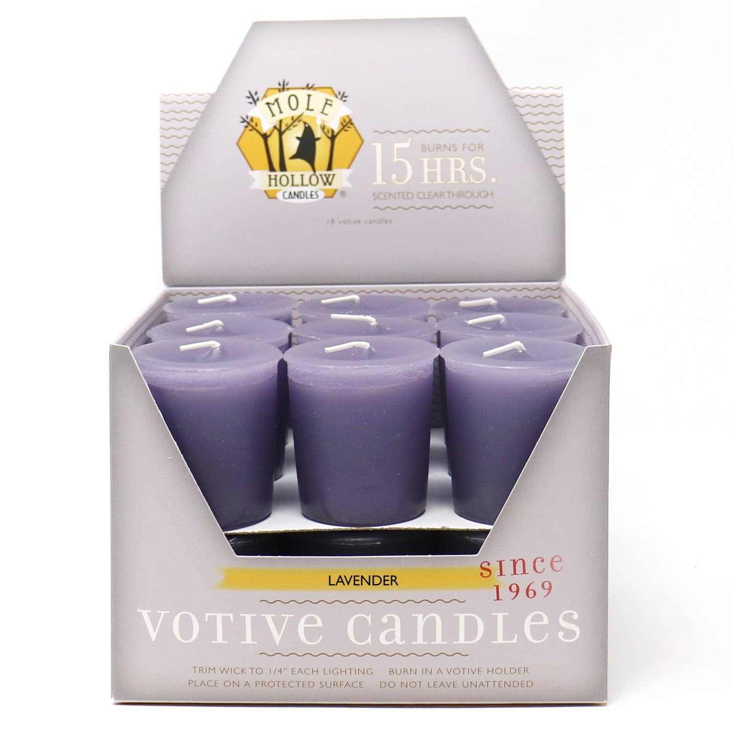 Read moreMole Hollow Candles’ Lavender scented votive candles feature a 100% cotton wick and custom-blended scent. Each lavender colored votive burns for 15 hours and is labelled for individual sale. Votives are sold in display boxes of 18 candles. Per candle price is displayed. • Each votive is labelled for individual sale • Sized to fit a standard-sized votive cup • Each candle burns for approximately 15 hours • 100% cotton wick • Hand poured in Sturbridge, MA