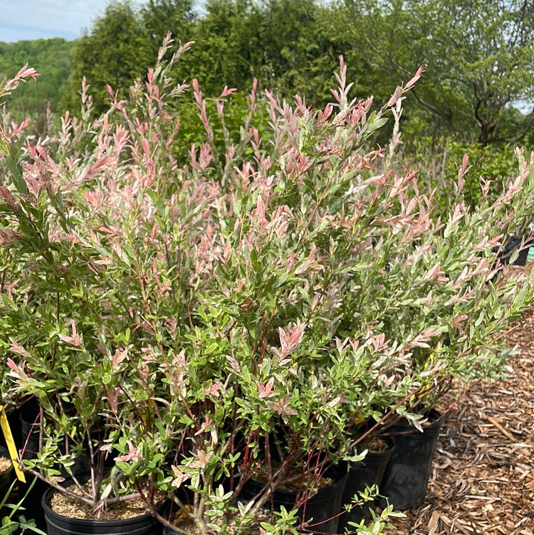 Read moreA lovely small shrub with pink stems and buds that open to dappled green, pink and white foliage. Some leaves will be all white. The stems are graceful and spreading. Best in partial shade.