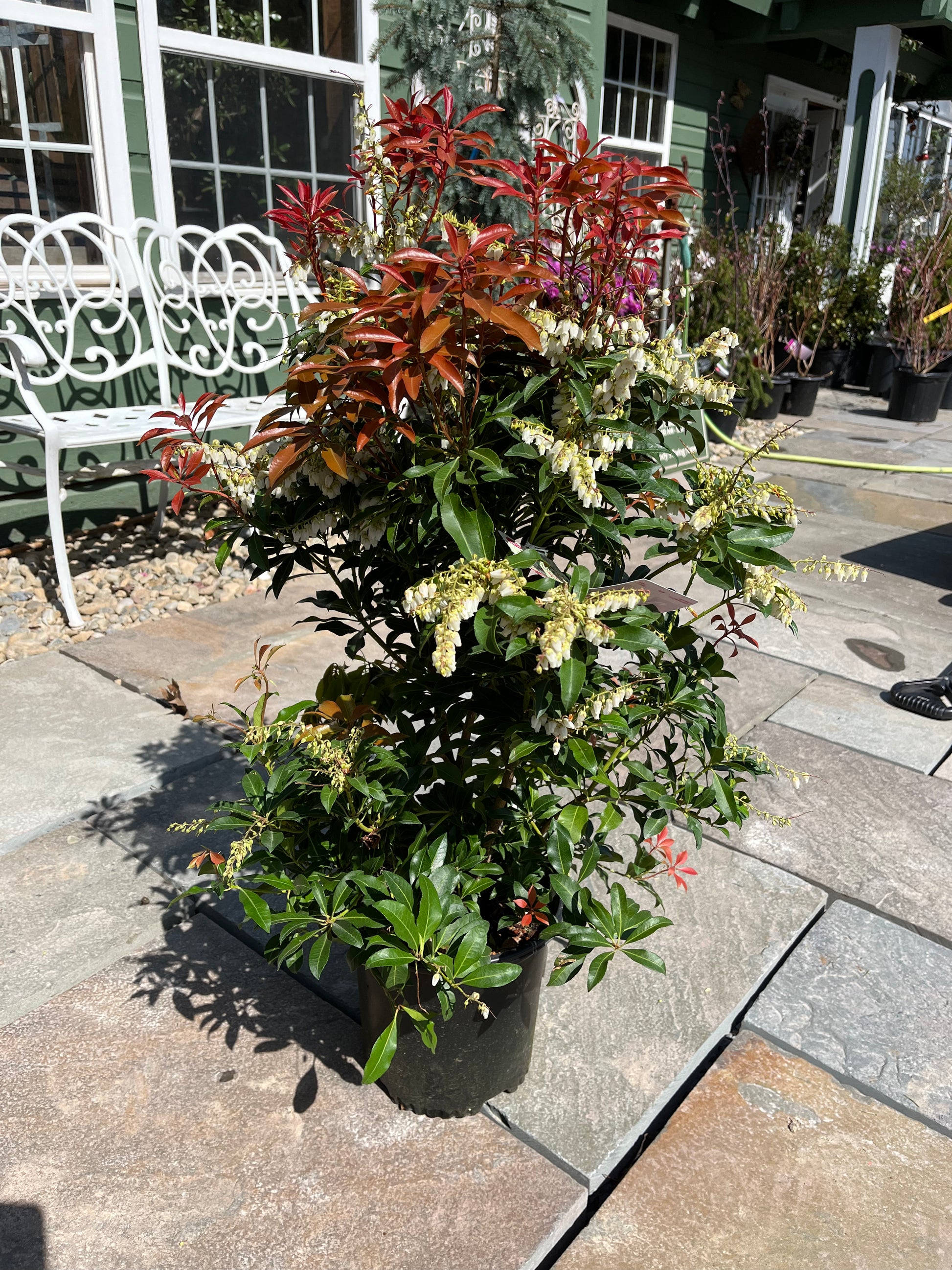 Read moreFiery red new growth rises from the lustrous evergreen foliage then ages to a deep green. Profuse, broad, drooping clusters of white flowers cool the flames, creating a breathtaking spring show. An ideal shrub for use in a foundation planting or landscape groupings, and an excellent companion shrub for azaleas.