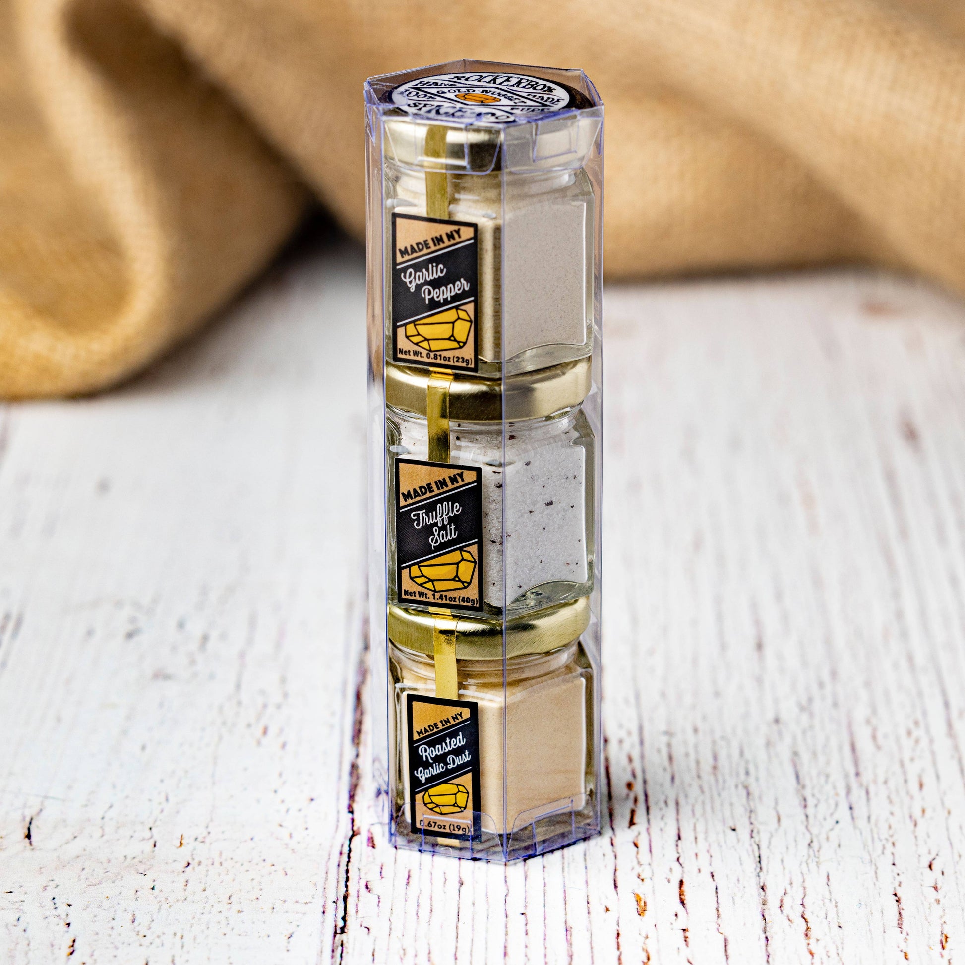 Read moreRoasted garlic popcorn… truffle salt popcorn… garlic + white pepper popcorn… how’s your favorite popcorn-lover going to decide? And the best part: All three of these versatile spices are delicious on far more than just popcorn! This combination is one of our most popular sets. It combines three all-purpose spices: one garlic, one salt, and one blend. Each is unique in its own right and is a Rockerbox customer favorite. This gift pack contains: - Black Truffle Salt - Roasted Garlic Dust - Garlic Pepper.