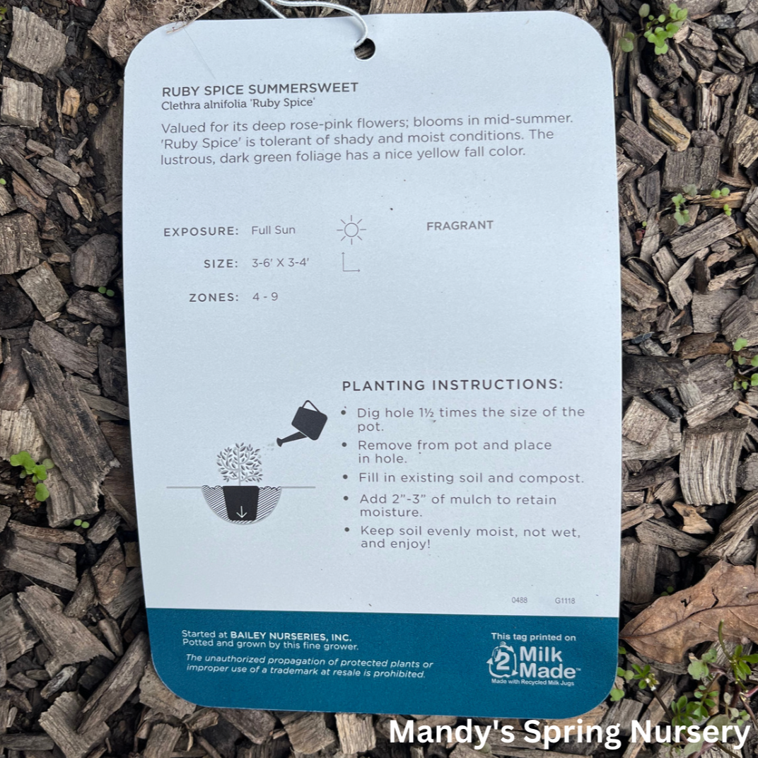 Read moreA cultivar selected for vastly improved bright pink flowers that do not fade to white. Blooms in midsummer and has nice yellow fall color. Clethra is shade tolerant but will also withstand full sun. A sport of 'Pink Spire'. A 1998 PA Gold Medal Award Winner and 2000 Cary Award Winner.