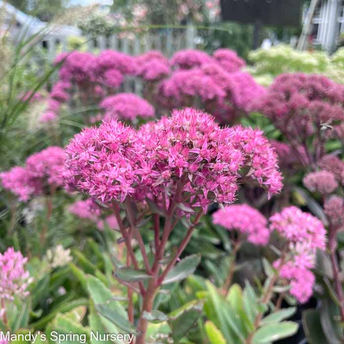 This English variety is distinguished from ‘Autumn Joy’ by its compact habit and large clusters of brilliant magenta pink flowers held on reddish stems from late summer into fall.