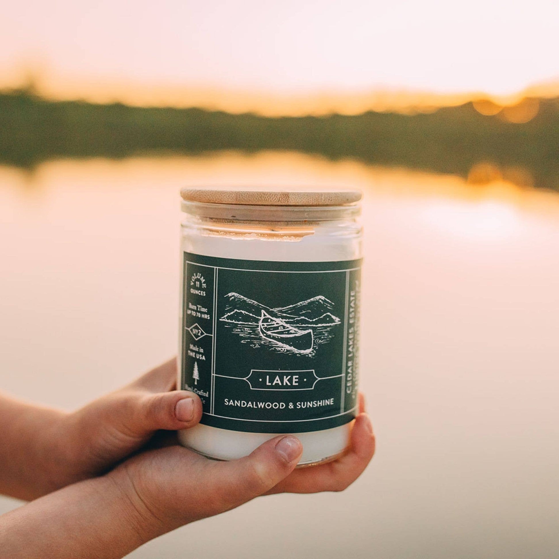 Read moreFragrance - sandalwood & sunshine. Part of our best selling Cedar Lakes Collection, this scent is a blend of freshness for perfect for year round selling. - 100% soy wax, not a blend, that is a natural and renewable resource grown in the USA. - 100% cotton wicks. - Hand-poured in small batches, in the USA - Adhere to all safety standards set by the IFRA (International Fragrance Association) - Phthalate and paraben free - Reusable or recyclable glass that is food safe - FDA compliant & recyclable bamboo lid Burn Times: Large (11 oz.) candles burn up to 70 hours; Small jar (7.5 oz.) candles burn up to 55 hours Our Fragrances: We spend a TON of time developing our candle fragrances. All of our scents tend toward and celebrate the natural elements that surround us. We want you to enjoy our candles as part of your home, but they should not overwhelm it. Our goal is to make sure the fragrance you experience when opening the candle packaging matches the scent when you are burning it.