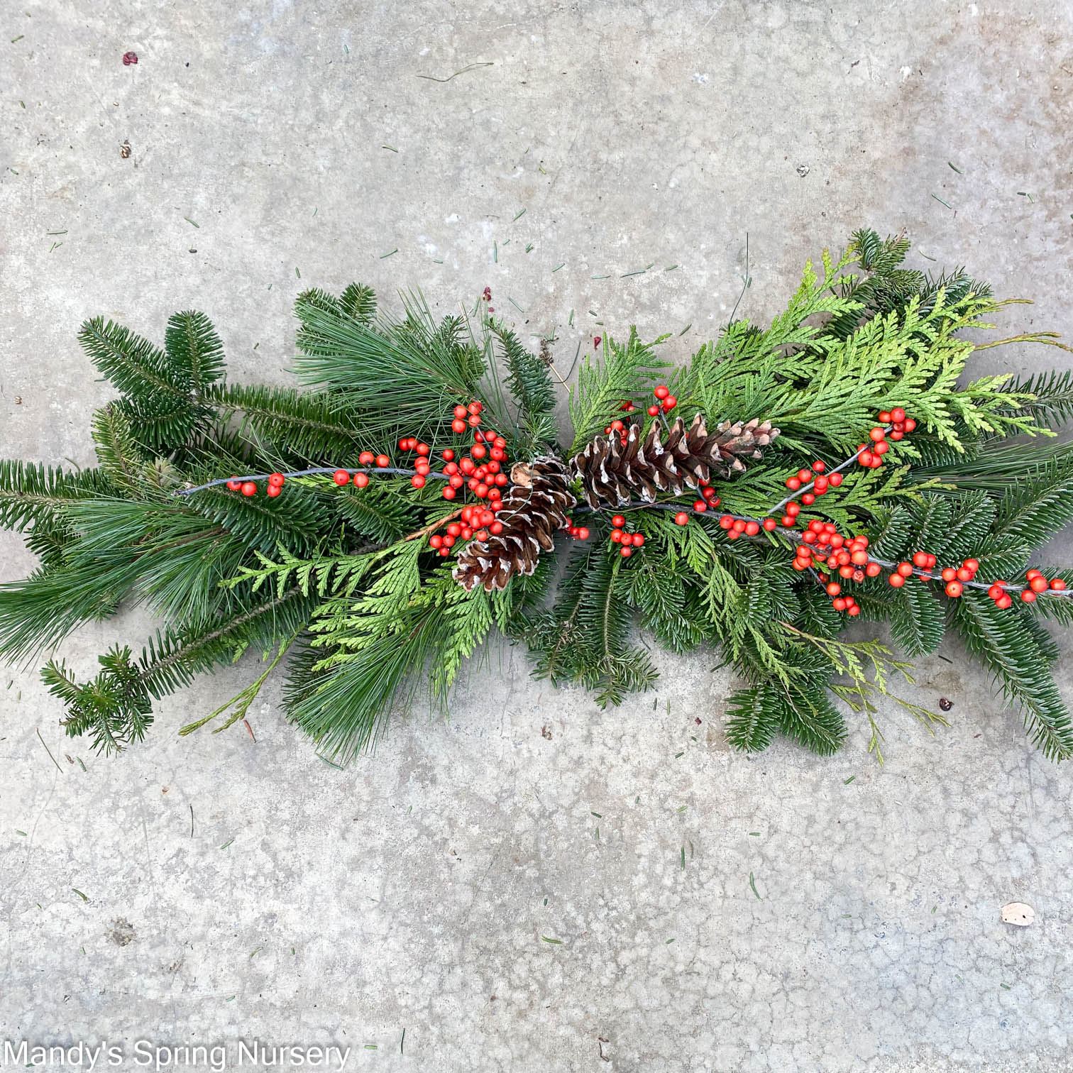 Made using evergreen boughs, holly berries, & pine cones harvested from our nursery fields. Spray bars without bows are 24". With bows, they are 30-36. " If opting for a bow, we offer a wide range of colors. Standard bows are solid colors. Premium bows are prints and premium fabric.