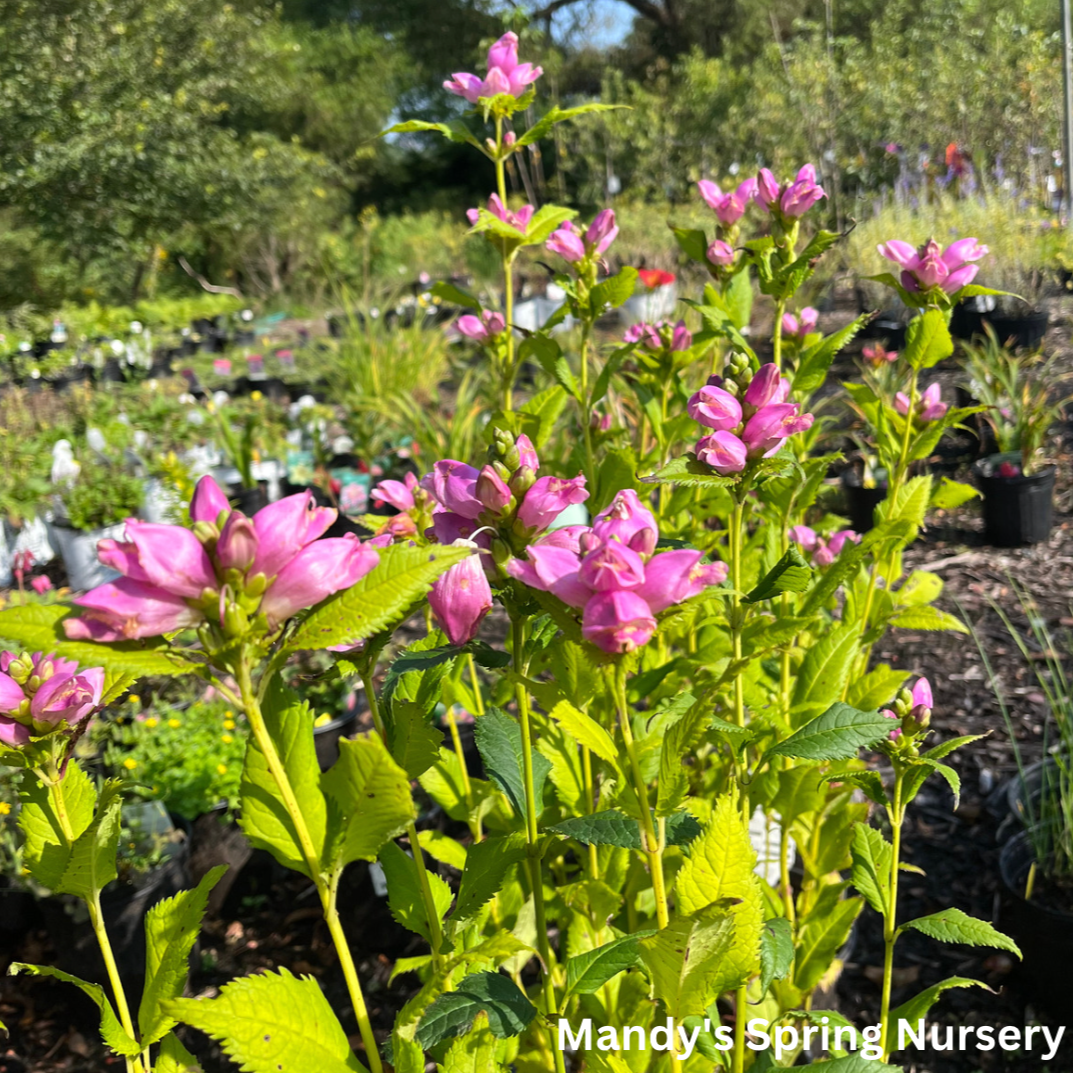 Turtleheads are native wildflowers that adapt beautifully to garden conditions. In this species, plants form an upright, bushy mound of green foliage, bearing upright stems of large bright-pink hooded flowers beginning in late summer. Best in a moist or wet site, this also adapts well to average border conditions. Terrific at the waterside. Excellent for cutting. Showy and long lived. Attractive to butterflies. Plants are easily divided in spring.