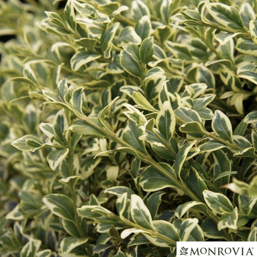 Small dark green leaves are bordered by an irregular creamy white variegation, perfect for adding interest and color to the year-round landscape. Easily pruned into topiary shapes or a formal hedge. Works well for containers and foundation plantings. Evergreen.