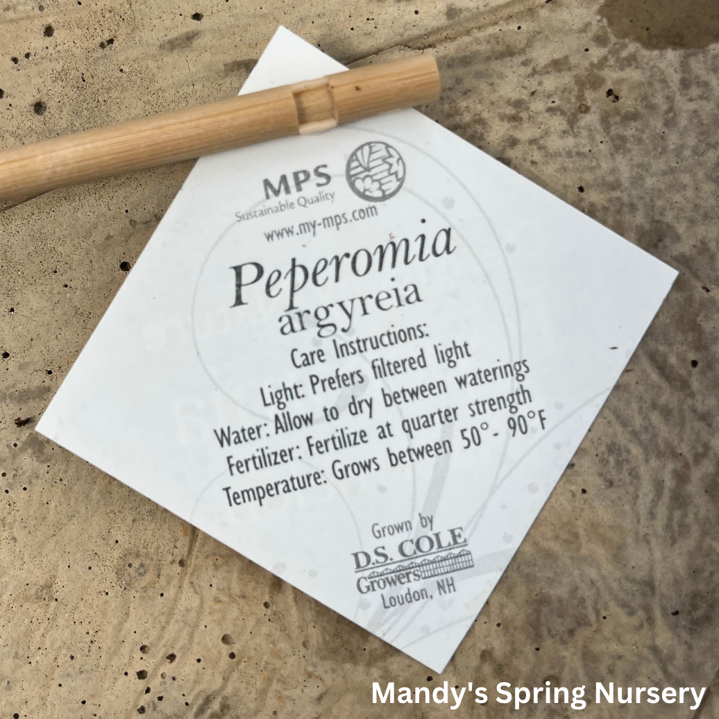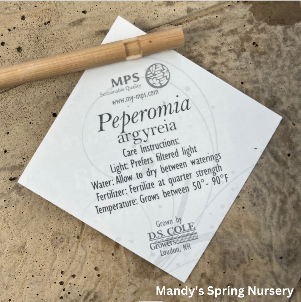 Peperomia argyreia Light - Peperomia does best in medium to bright indirect light and should be protected from direct sunlight. Water - Allow the top two inches of the soil to dry out between waterings. Keeping the peperomia on the dry side is better than saturating it.