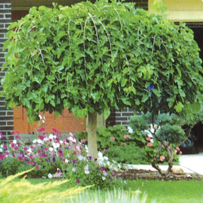 Ornamental non-fruiting tree, grafted on a 4'-5' stem. Pendulous branches with large, shiny leaves.