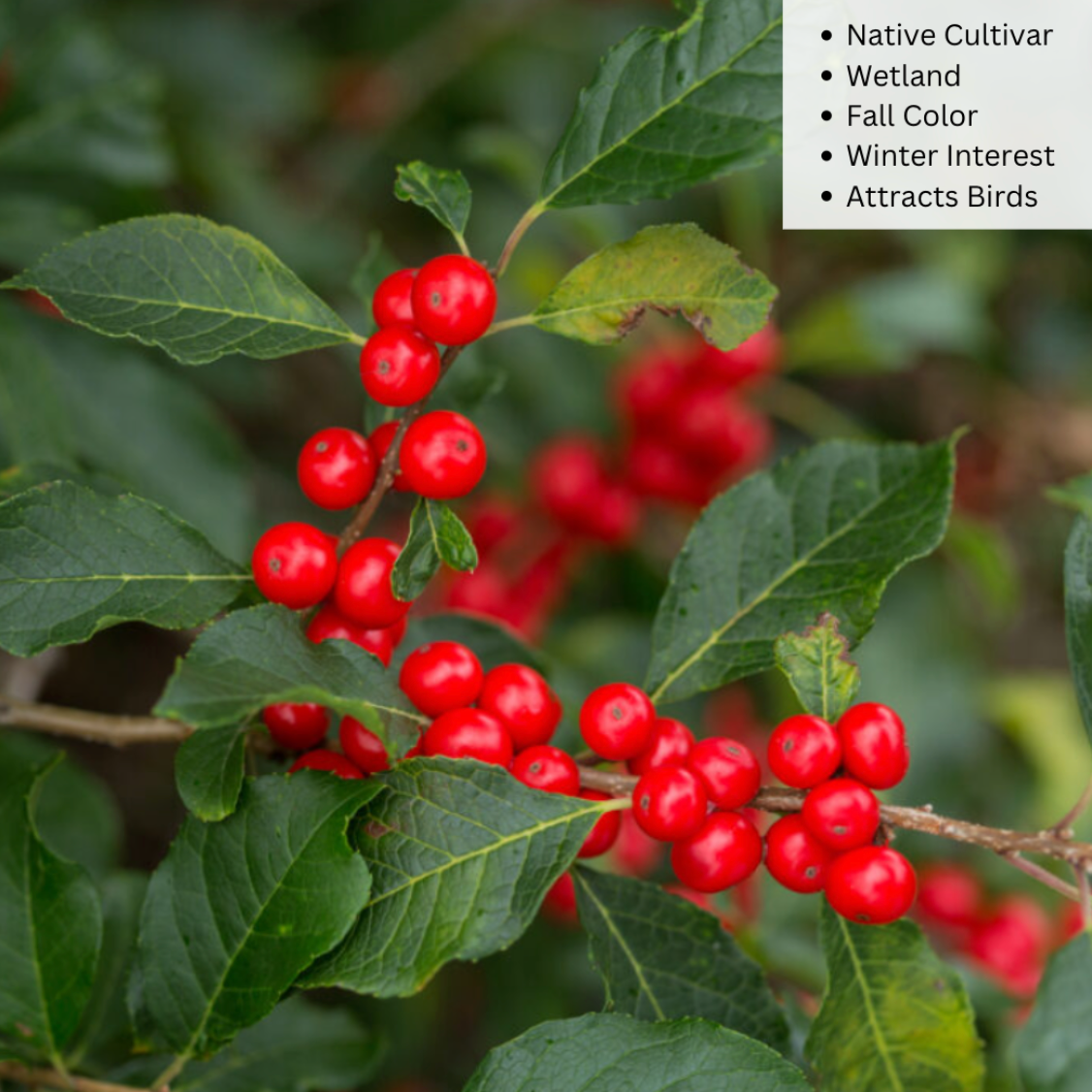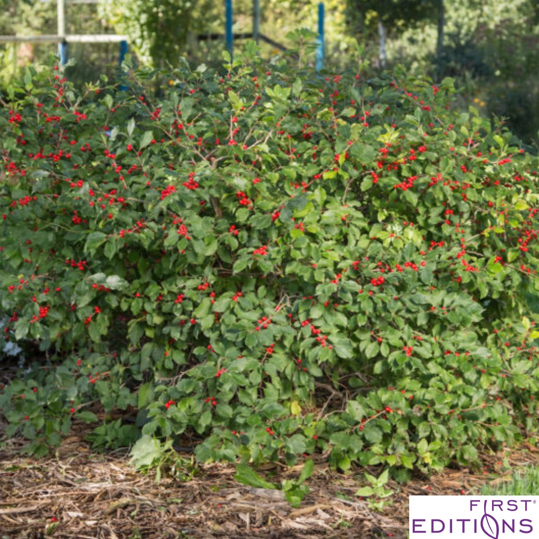 Wildfire™ Winterberry has dark green foliage and abundantly large, bright red fruit in fall and early winter, providing stems ideal for floral or seasonal displays. Its rounded habit creates a wonderful foundation plant, specimen, or hedge. A male companion plant, such as Jim Dandy or Sourthern Gentleman Winterberry, is needed for pollination.
