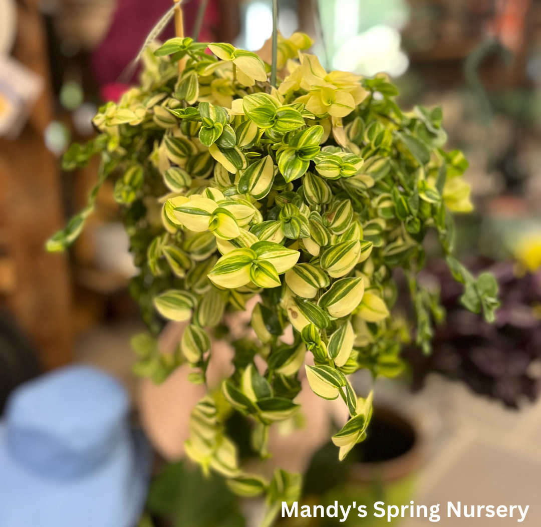 This tradescantia is known for its bright yellow leaves with white variegation. It is one of the easier to care. Thrives in bright indirect light. Water your Tradescantia when the top 50%-75% of soil is dry.